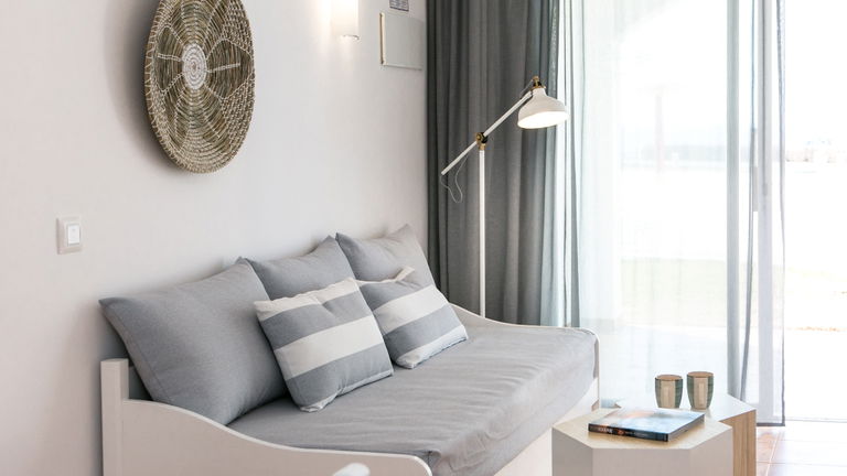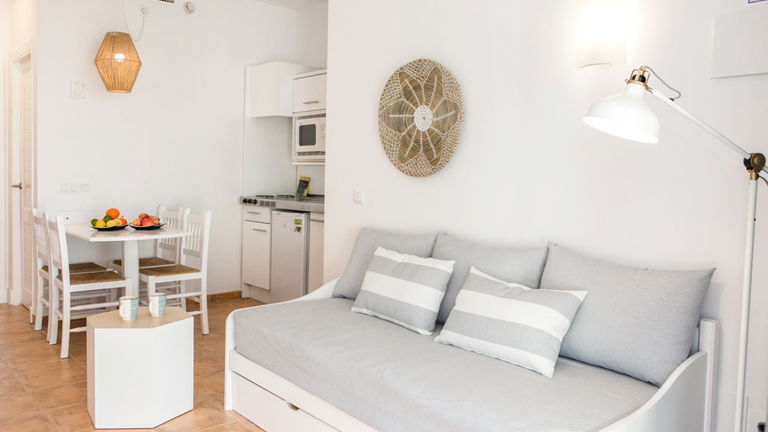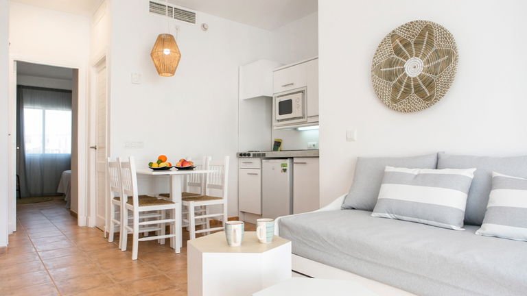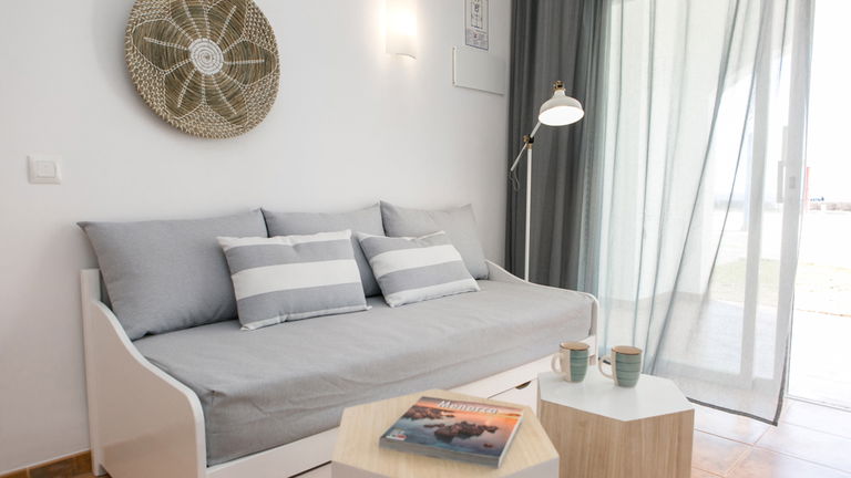 Amplias habitaciones pensadas para alojar a un máximo de 3 adultos + 1 niño o 2 adultos + 2 niños. Equipadas con terraza, una habitación, cocina completa, baño privado y salón comedor con sofá cama.